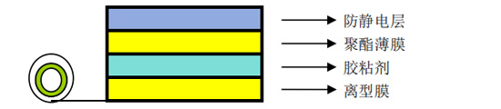产品描述:以聚酯薄膜为基材一面涂布防静电液,另一面涂布胶黏剂并贴合离型膜而成。